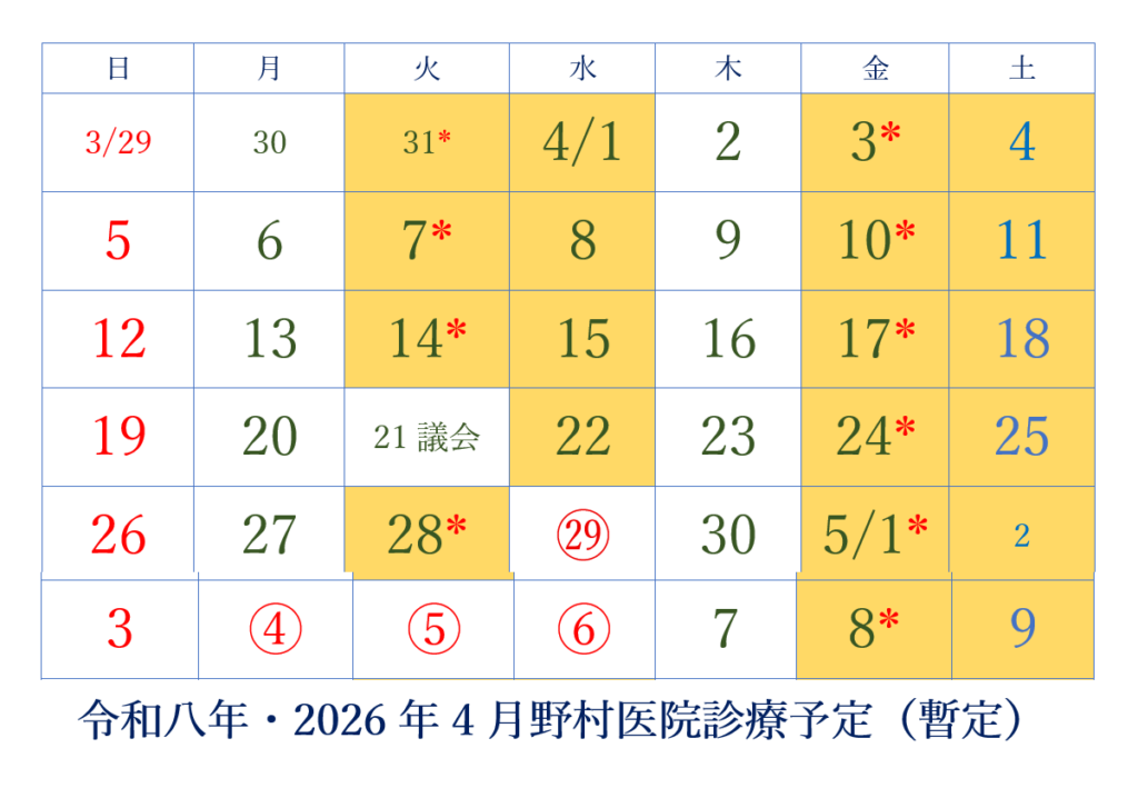 四月の診療予定をお知らせします。
