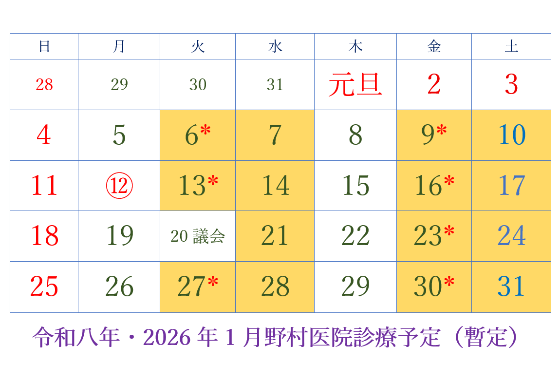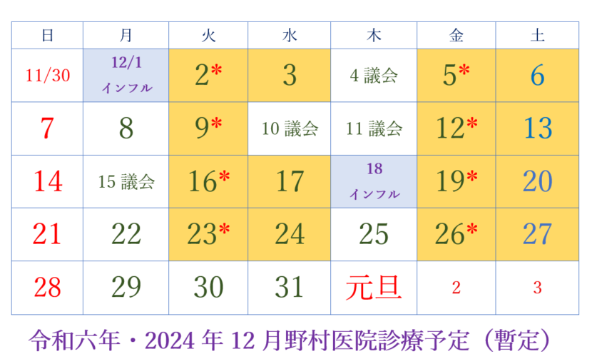 野村医院の12月の予定をお知らせいたします。さらに、1月の予定表も下に掲示します。