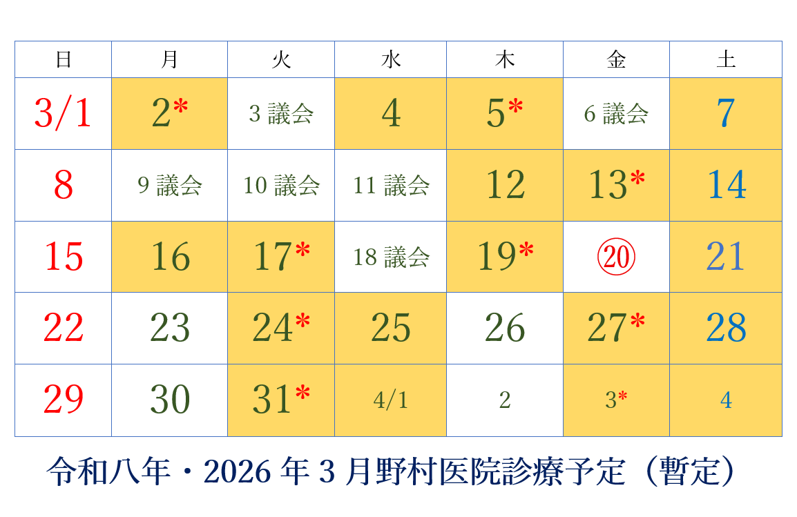 野村医院の3月の予定をお知らせします。
